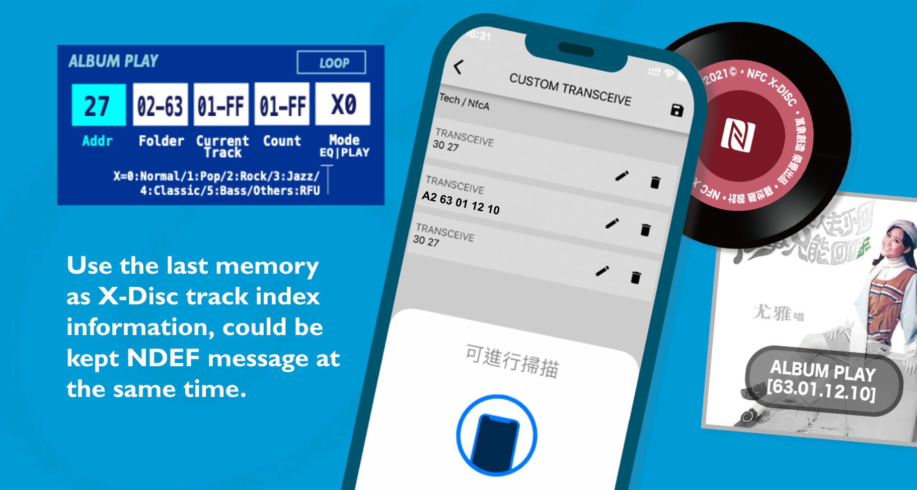 還是得依循電唱機所訂的曲目索引格式,才可以運行無阻。為了能達到『物盡其用』的理念,電唱機將曲目索引的位址訂在X-Disc裡晶片,可用記憶體的最後,其用意是前面的NDEF紀錄可以照用,通常閒置的尾端空間,拿來物盡其用 (Maker就是喜歡一魚雙吃)。